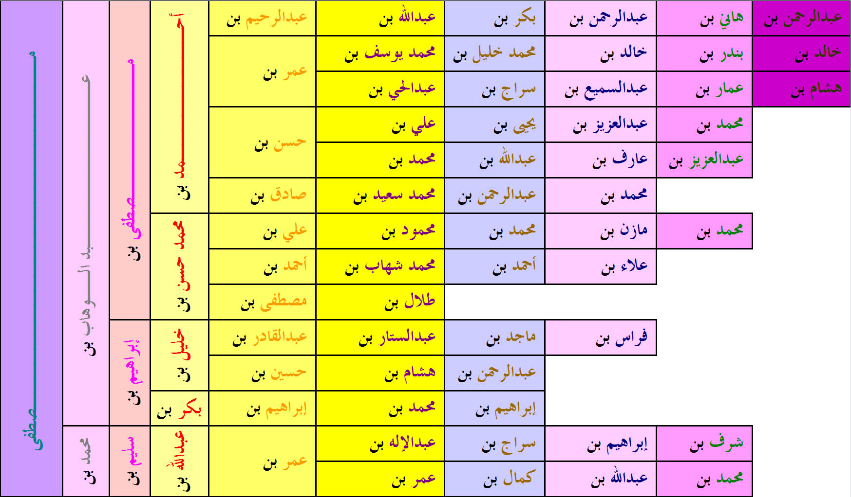 * الأشخاص الذين يحملون نفس اللون هم من طبقة واحدة سواء كانوا أخوه أو أبناء عم أو أبناء عمومه،مثل:                                (*أحمد و *محمد حسن)  وكذلك (عبدالرحيم و مصطفى) وكذلك (علي و طلال).